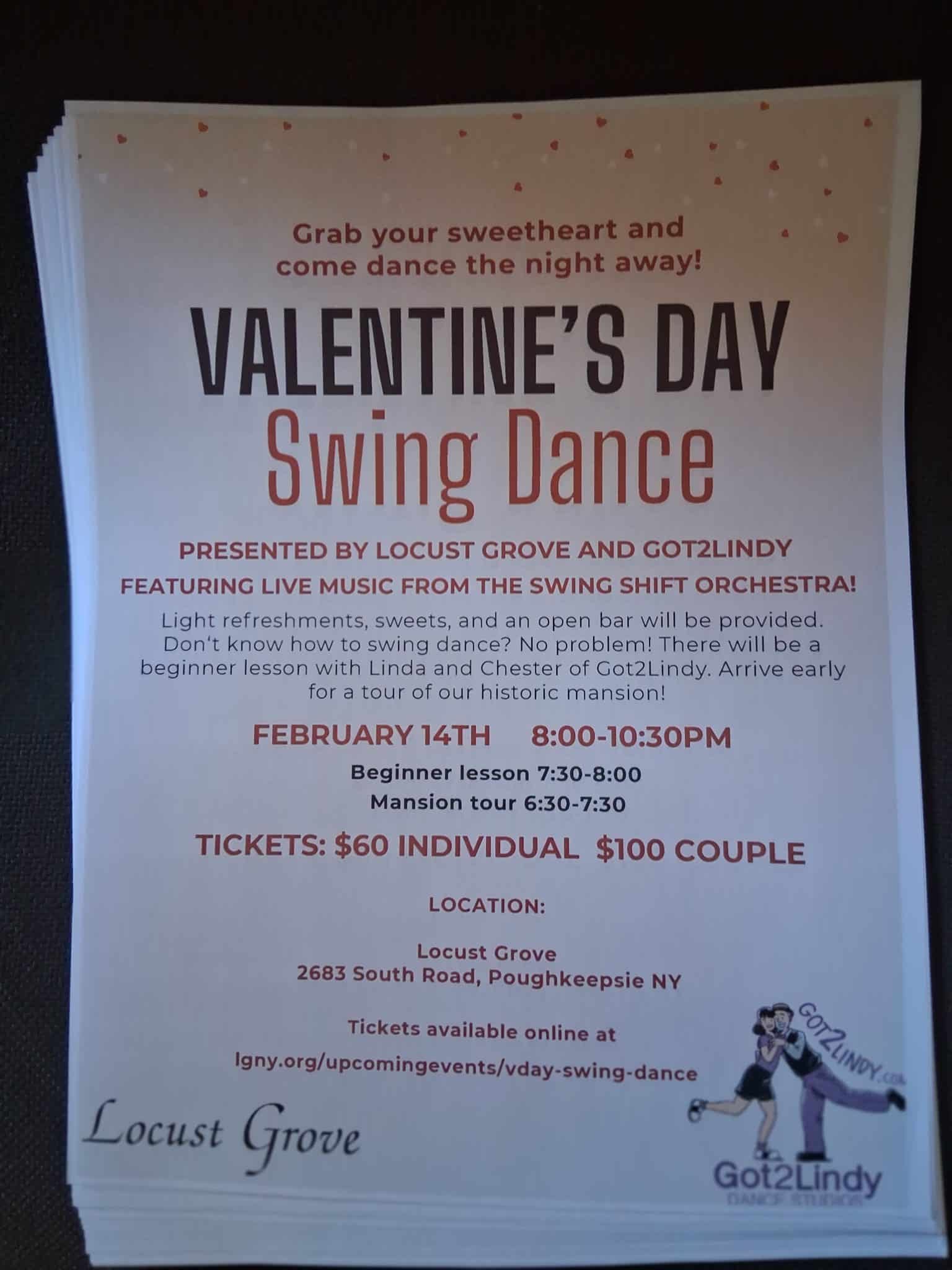 Locust Grove 2683 South Road, Pougkeepsie, NY, United StatesValentine's Day Dance at Locust Grove with the SWING SHIFT ORCHESTRA. Beginner swing dance lesson by Got2Lindy, open bar, mansion tour and refreshments included.